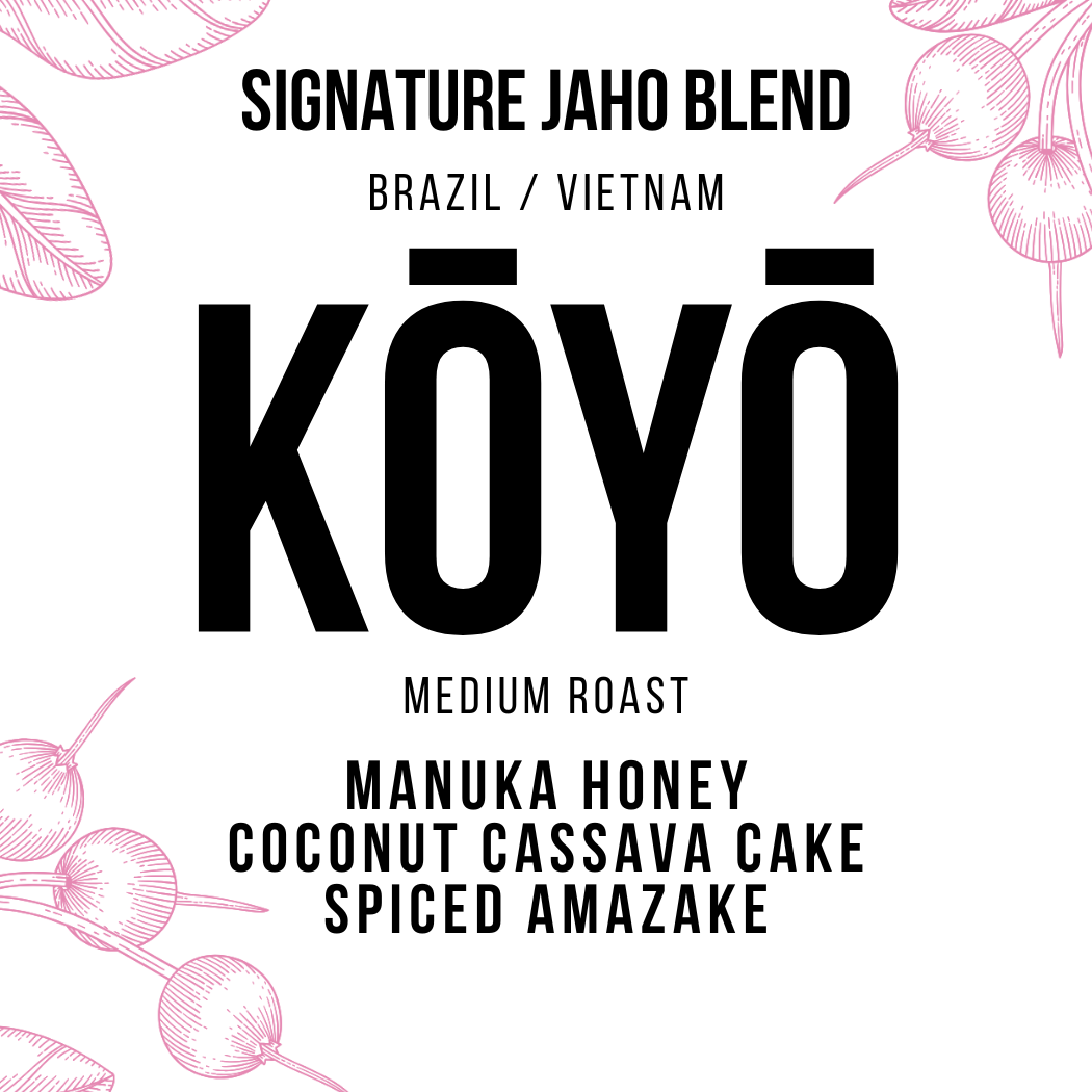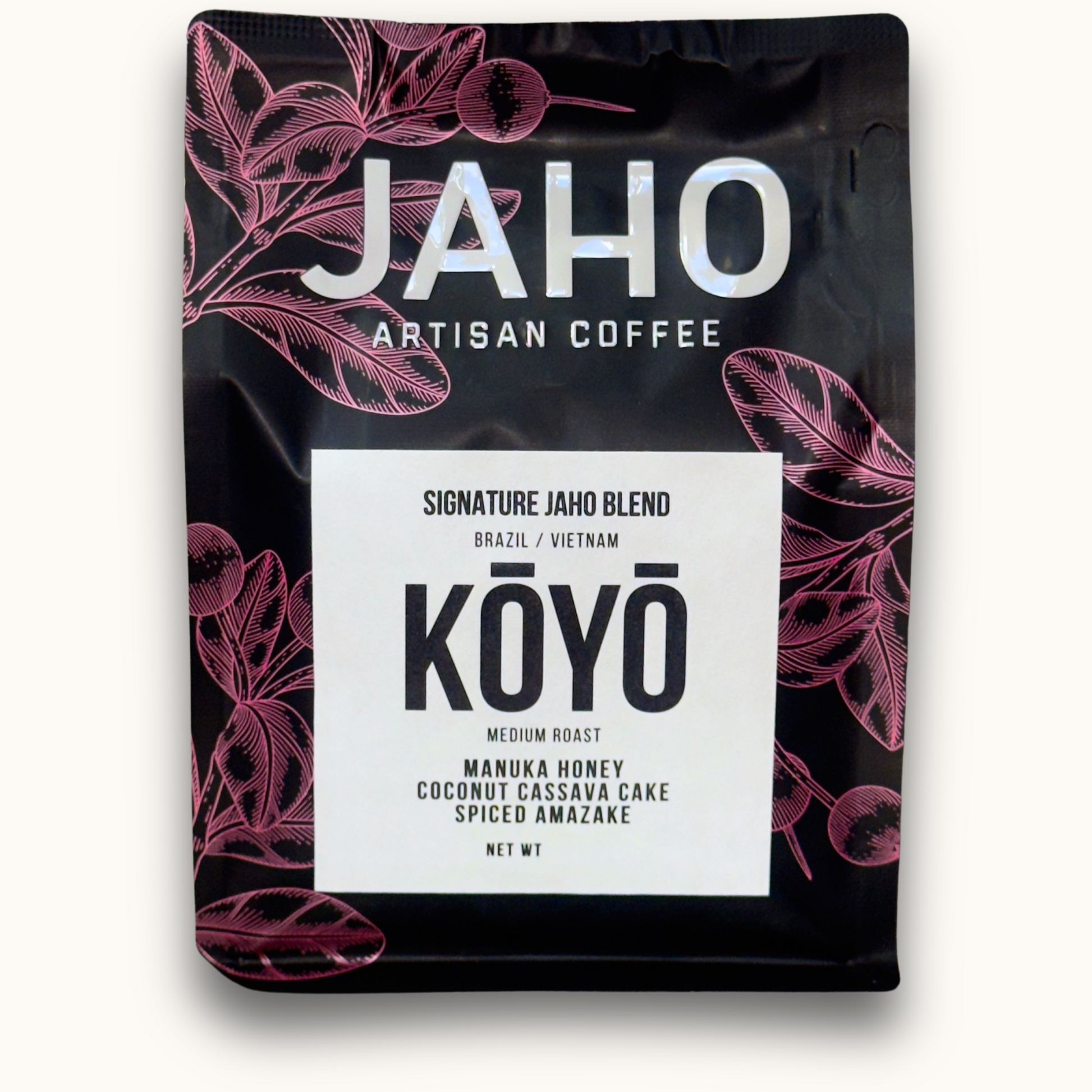 Inspired by the Japanese tradition of autumn leaf viewing, Kōyō is a comforting medium roast blend of Brazilian and Vietnamese coffees. Notes of Manuka honey, coconut cassava cake, and spiced amazake unfold in warm, textured layers.