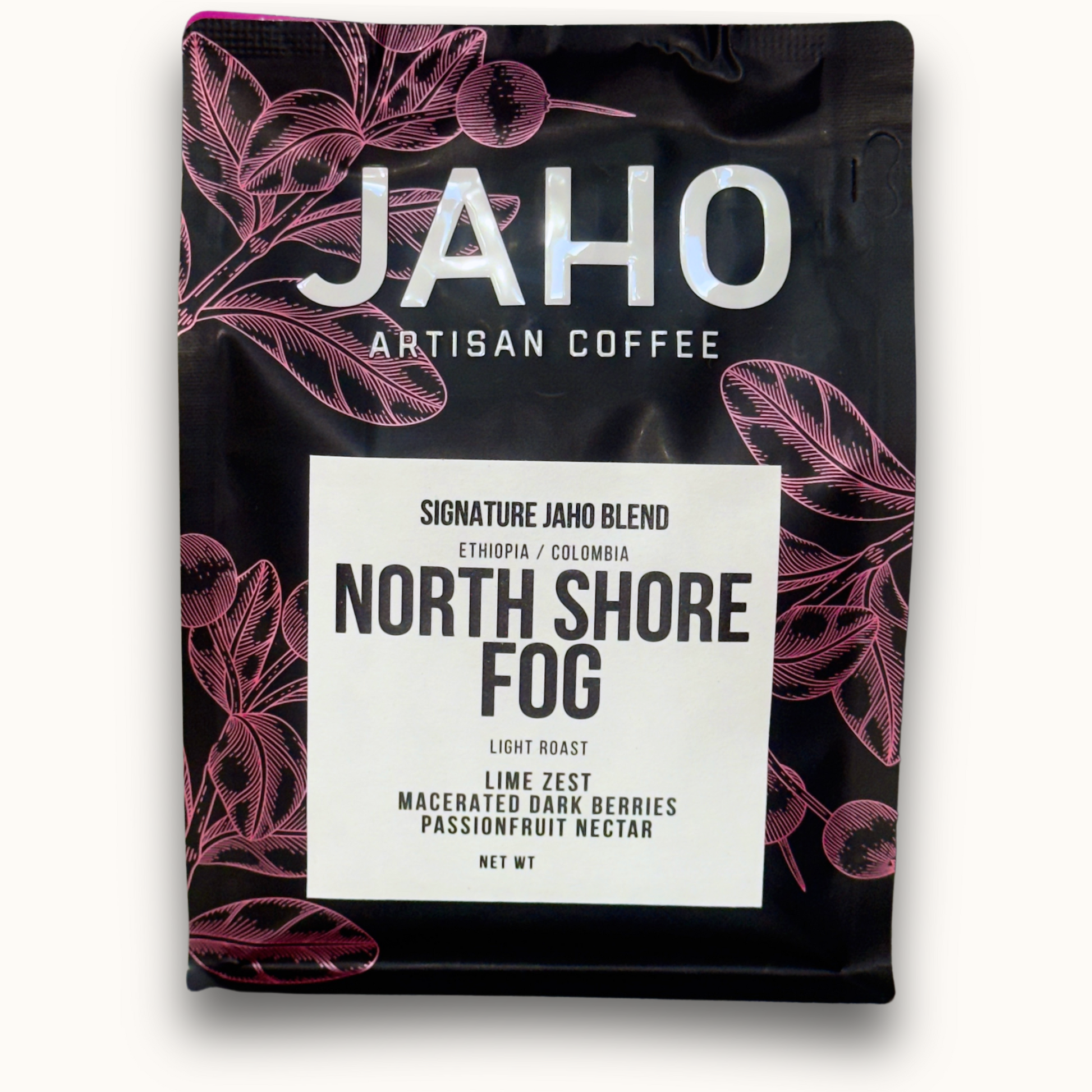 A bright and floral light roast, North Shore Fog blends Colombian and Ethiopian coffees into a juicy, expressive cup with notes of lime zest, macerated dark berries, and passionfruit nectar. A radiant tribute to foggy mornings and slow rituals from Jaho's home.